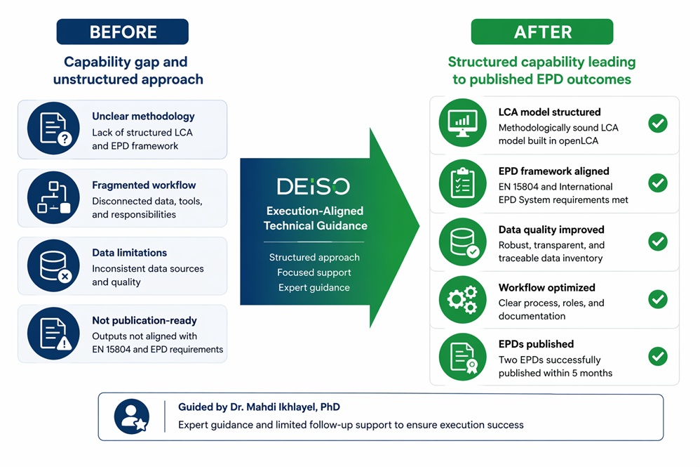 DEISO role: Execution-aligned technical guidance covering LCA modeling (openLCA), sustainability framework structuring, and targeted expert follow-up support.