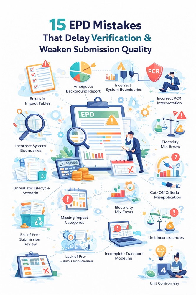 Below is a structured list of 15 critical mistakes that frequently undermine EPD submissions. Each issue is explained with practical guidance on how to avoid it before the verifier identifies it for you.